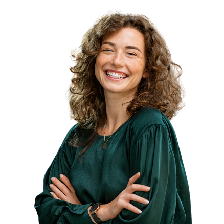 Mujer sonriente con brazos cruzados, fondo blanco.